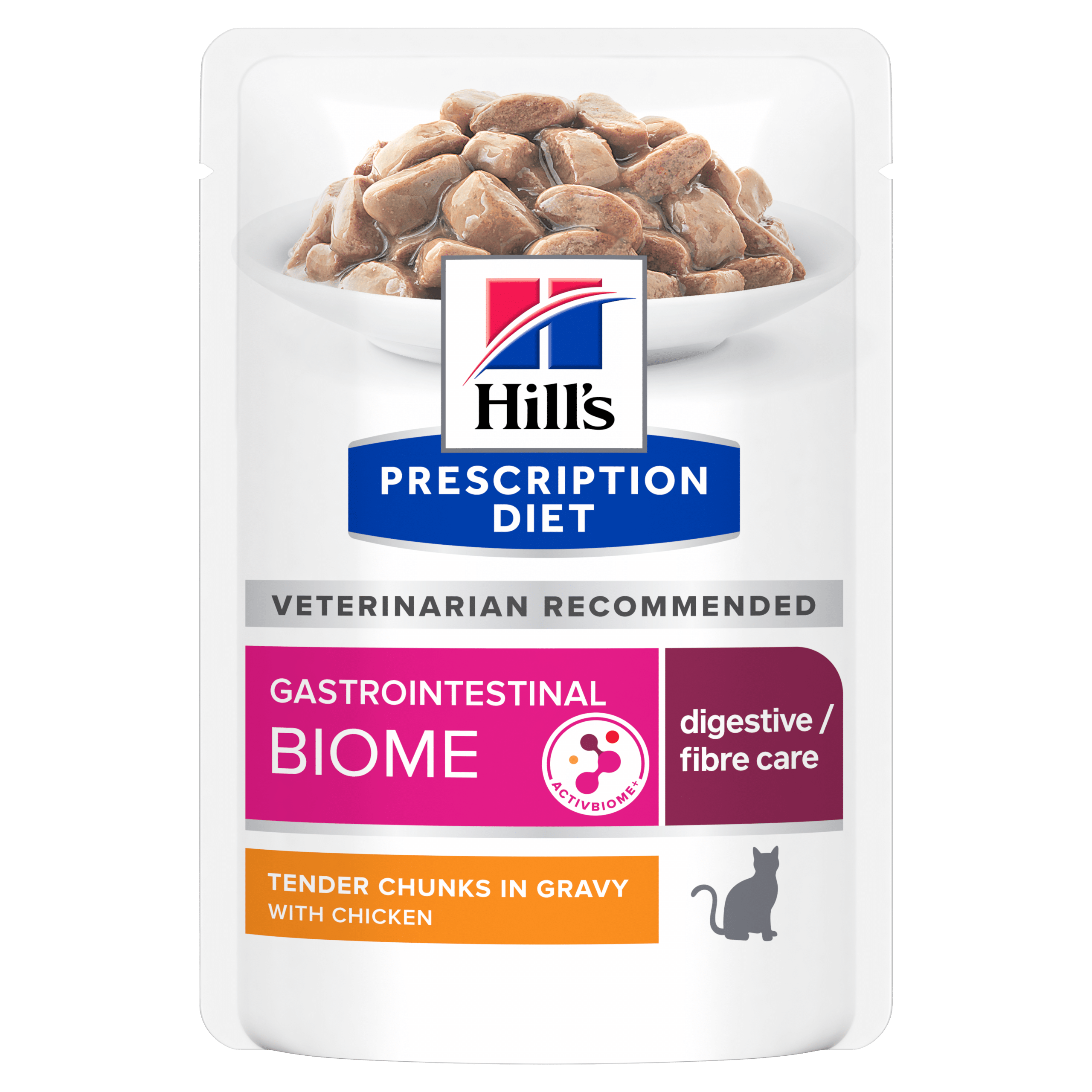 Вологий корм для котів Hill’s PRESCRIPTION DIET Gastrointestinal Biome, з куркою – повнораціонне дієтичне харчування, спеціально розроблене дієтологами та ветеринарними лікарями для покращення травлення, якості й регулярності випорожнень і запобігання рецидивів шлунково-кишкових розладів.