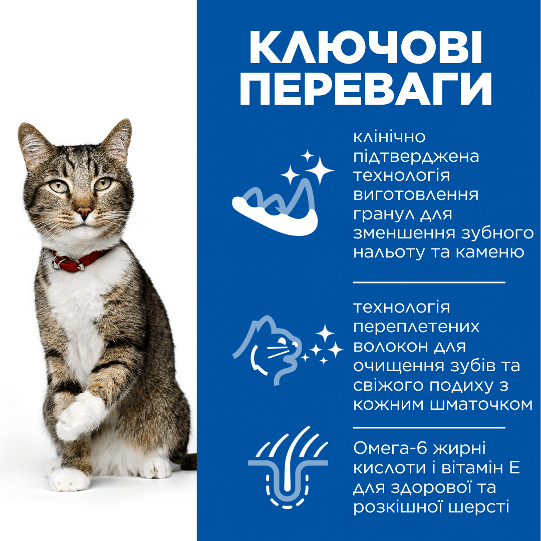 Здоров’я зубів є життєво важливим для підтримання загального стану здоров’я та гарного самопочуття кота. Hill’s SCIENCE PLAN Oral Care забезпечує дорослого кота ретельно збалансованим харчуванням, яке покращує здоров’я ротової порожнини за допомогою клінічно підтвердженої технології виготовлення гранул.