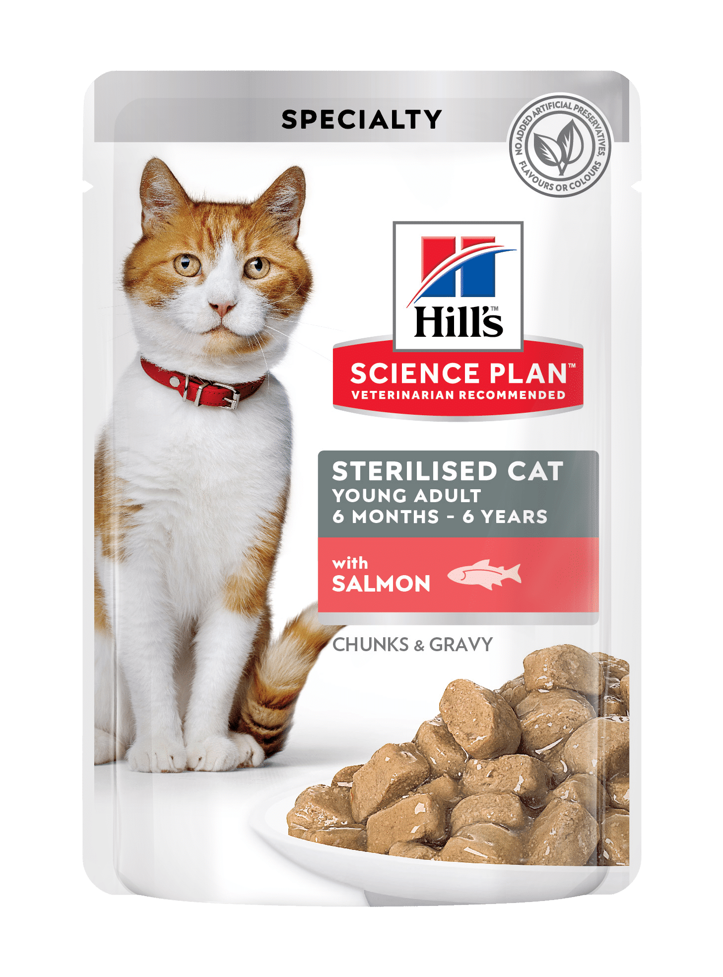 Вологий корм для котів Hill’s SCIENCE PLAN Young Adult Sterilised, з лососем – повнораціонне харчування, спеціально розроблене дієтологами та ветеринарними лікарями для стерилізованих котів віком від 6 місяців до 6 років.
