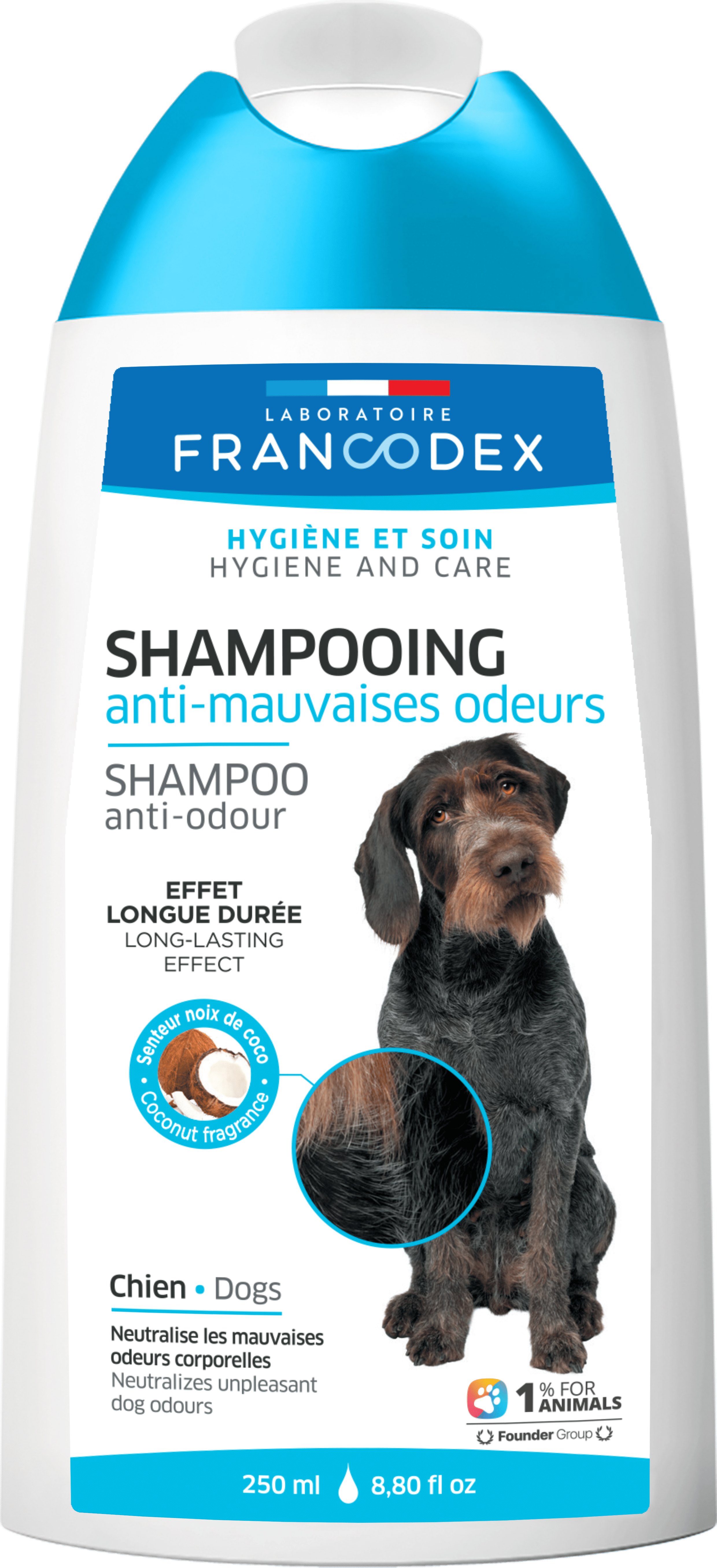 LABORATOIRE FRANCODEX ANTI-ODOUR SHAMPOO (Шампунь для усунення неприємного запаху для собак Лаборатуар Франкодекс), Розроблений на основі екстракту лакриці, нейтралізує та усуває неприємні запахи з довготривалим ефектом. З високим вмістом вітаміну F, зміцнює та захищає шкіру та шерсть. Завдяки нейтральному pH ніжно очищує та зберігає природне зволоження шкіри навіть при частому використанні. і.