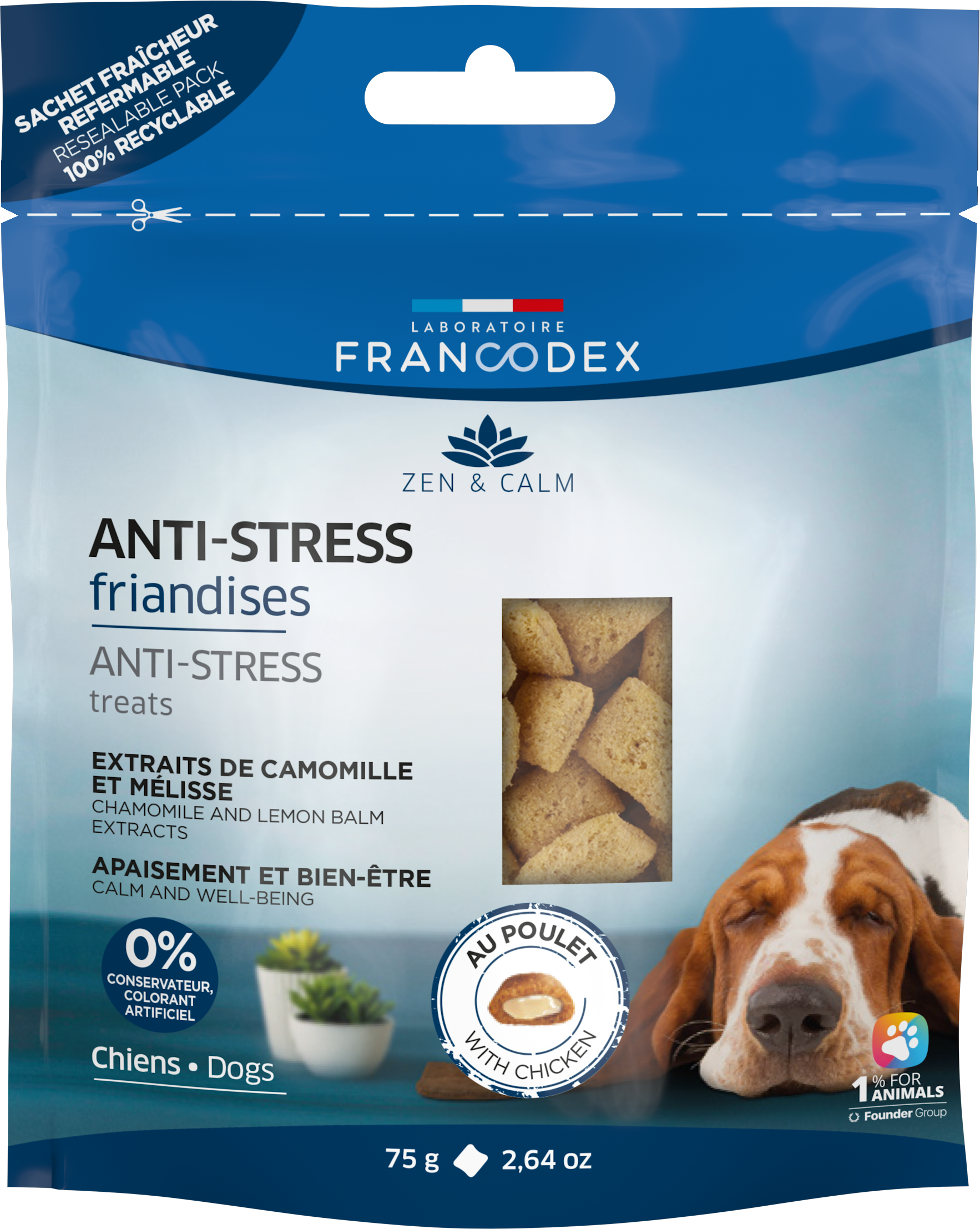 LABORATOIRE FRANCODEX ANTI-STRESS TREATS Антистрес ласощі для собак містять L-триптофан. Організм використовує цю амінокислоту для вироблення серотоніну, нейромедіатора, який допомагає заспокоїти гіперактивних, нервових або тривожних собак, без побічних ефектів або залежності.