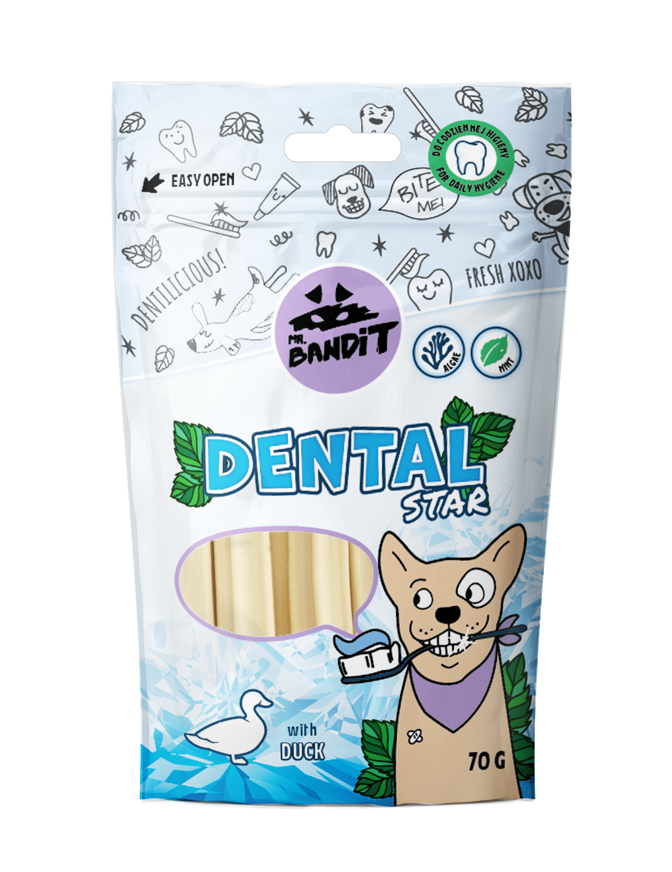 Гнучка структура ласощів Mr. Bandit Дентал гарантує краще очищення та тривале задоволення від жування.Склад: Продукти рослинного походження, м’ясо качки 16%, екстракти рослинного білка, порошок печінки птиці 4%, гліцерин, сорбіт, сушені водорості 4% (Laminaria japonica), м’ята сушена 1%