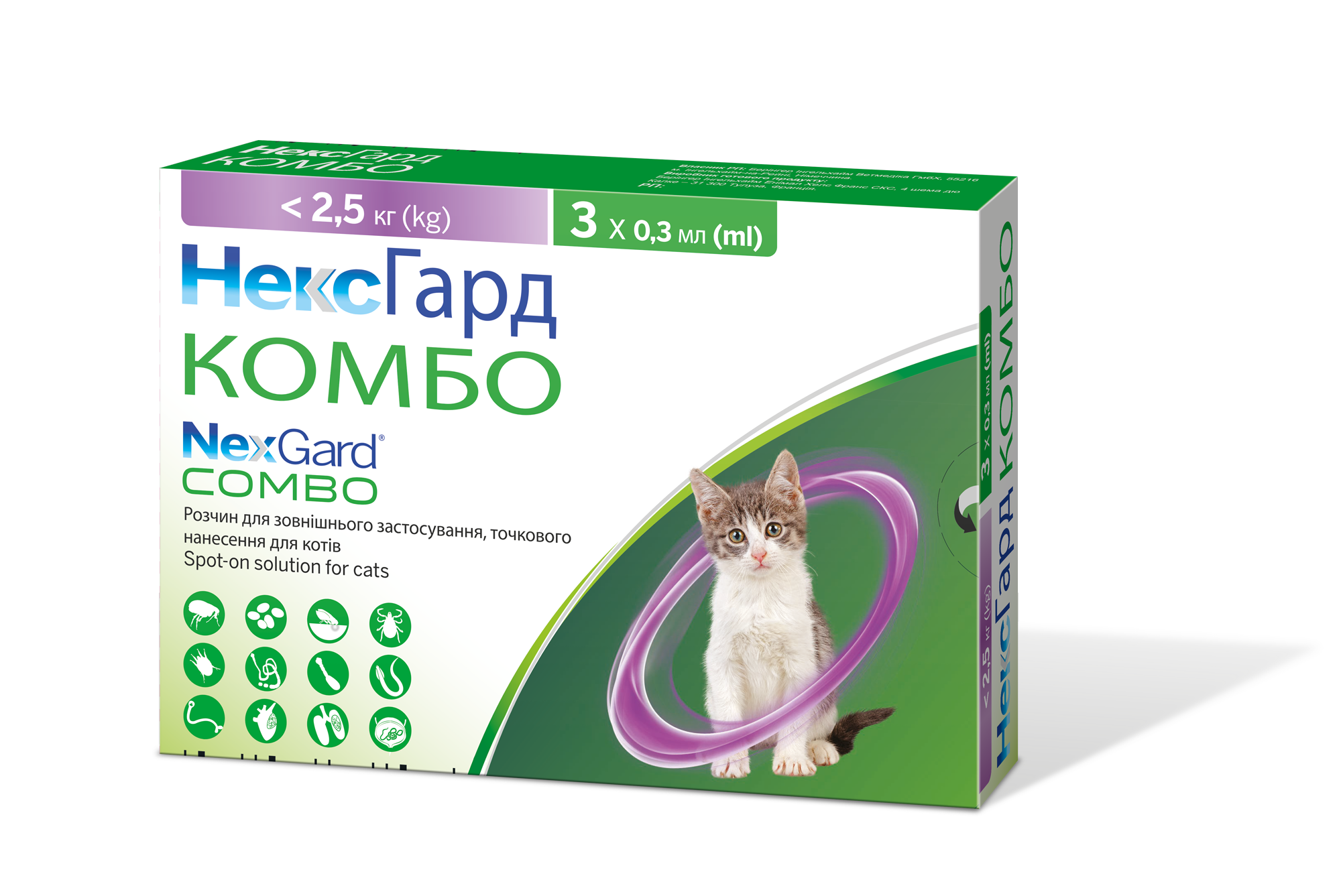 НексГард Комбо – краплі від бліх, кліщів та гельмінтів для котів та кошенят від 8-тижневого віку та вагою від 0,8 до 2,5 кг.