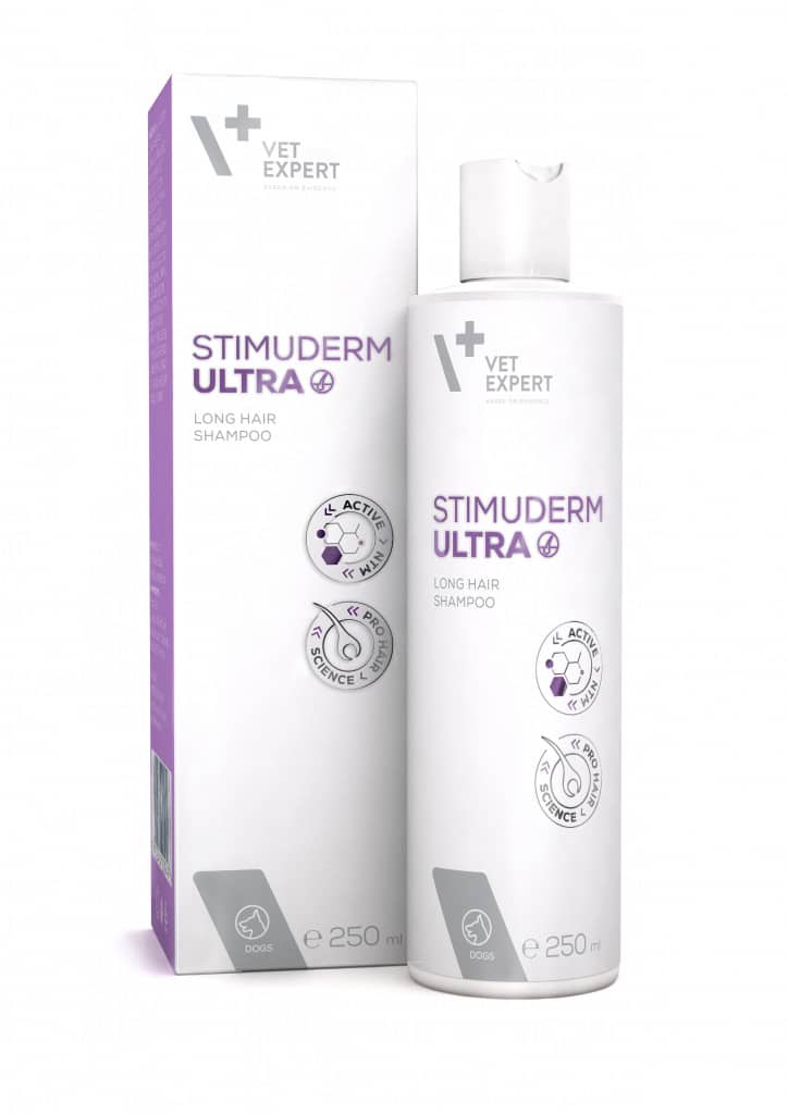 Vet Expert Стимудерм Ультра Шампунь для довгошерстих собак – це інноваційний дермокосметичний шампунь, рекомендований для шкіри та шерсті довгошерстих собак з надмірним випаданням шерсті різного походження та/або з ослабленою шерстю. Активною речовиною шампуню є запатентована молекула ACTIVE NTM з доведеною ефективністю у стимулюванні відростання шерсті. Продукт не містить SLS/SLES, парабенів, ароматизаторів, барвників. Підходить для чутливої шкіри.Застосування: Шампунь «Стимудерм Ультра» для короткошерстих собак застосовувати за схемою, наведеною нижче. Основні зміни шкіри, випадання шерсті: 1 ЕТАП: 2 перші купання з інтервалом 5 днів, 2 ЕТАП: після другого купання перерва тиждень, а потім 1 купання на тиждень до досягнення ефекту (відростання ділянок облисіння). Після досягнення відростання: 3 ЕТАП: 1 купання кожні 3 тижні. Намочіть шерсть теплою водою, нанесіть невелику кількість шампуню на шерсть, спініть, масажуйте прибл. 5 хвилин. Захищайте очі та вуха собаки під час купання. Ретельно промити. При необхідності повторіть процедуру. У разі алопеції та посиленого випадіння шерсті використання шампуню слід супроводжувати одночасним застосуванням сироватки Стимудерм Ультра, призначеної для щоденного місцевого застосування на шкірі та шерсті.